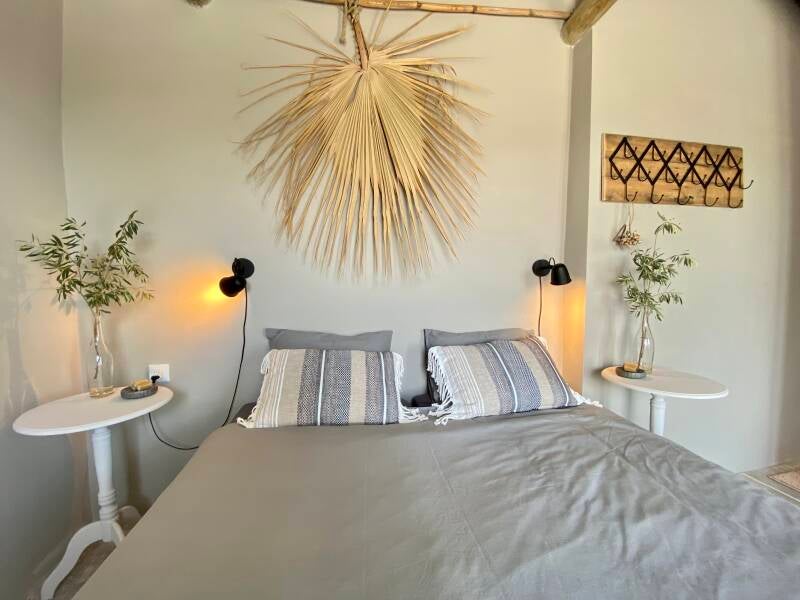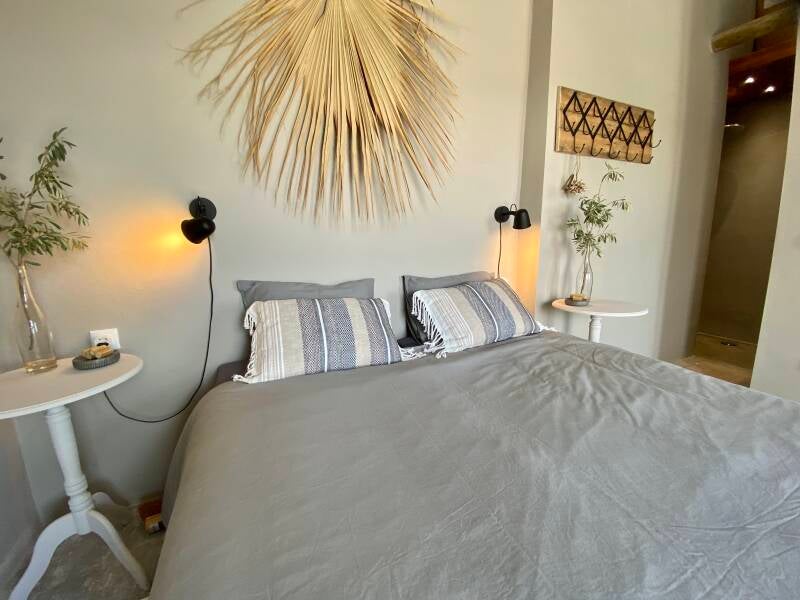 Deze hoge, ruime slaapkamer heeft een 2 persoons bed (160 x 200 cm). Wakker worden met het allermooiste uitzicht. Via de balkondeuren loop je zo het terras op. De kamer heeft voldoende kastruimte en heeft een eigen inloopdouche (met regendouche), wastafel, eigen apart toilet en airco. Op deze kamer kan eventueel op aanvraag een kinderbedje bij geplaatst worden.